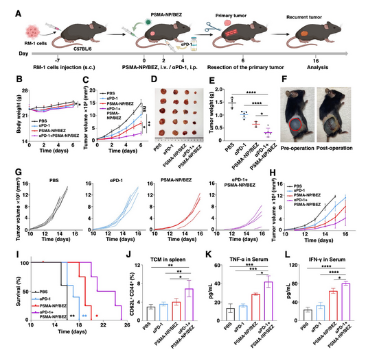 為探究PSMA-NP/BEZ與αPD-1聯用的潛力,研究人員構建了前列腺癌復發模型:在小鼠右髖接種原發腫瘤后,分別用PBS、αPD-1、PSMA-NP/BEZ及二者聯用處理,6天后切除原發腫瘤模擬臨床gen治性切除,記錄小鼠存活、體重及腫瘤體積。結果顯示,PSMA-NP/BEZ未加重αPD-1導致的體重減輕,安全性良好;在原發腫瘤方面,αPD-1單獨處理與PBS組無差異,PSMA-NP/BEZ單獨處理抑瘤率為54%,而聯用組抑瘤率達到82.5%,抑瘤效果更加;原發腫瘤切除后,除2只小鼠因手術相關原因死亡外,聯用組較其他組而言能夠延緩腫瘤復發、延長小鼠存活時間。進一步研究發現,聯用組小鼠脾臟中CD44?CD62L?中樞記憶T細胞占比(8.6%)高于單獨處理組,血清中促炎細胞因子TNF-α和IFN-γ濃度也更高。綜上,αPD-1與PSMA-NP/BEZ聯用可激活抗腫瘤免疫、誘導免疫記憶,進而預防腫瘤復發。
