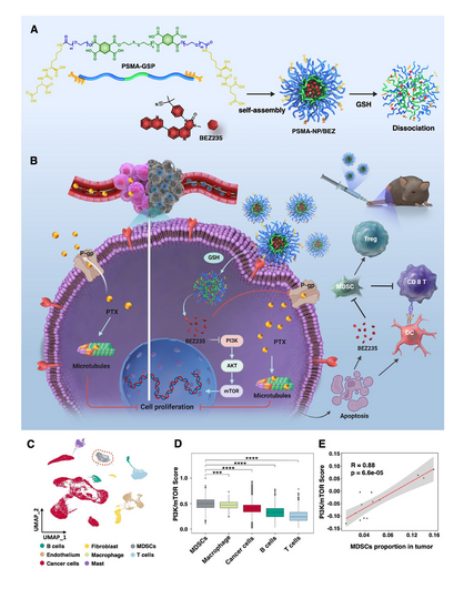 為突破上述局限,研究人員構建了靶向前列腺特異性膜抗原(PSMA,前列腺癌特異性表達的跨膜糖蛋白)的納米藥物遞送系統:將 PSMA 配體與谷胱gan肽(GSH)敏感聚合物(GSP)偶聯形成 PSMA-GSP,其可自組裝并負載 BEZ235 前藥,構建成納米顆粒(PSMA-NP/BEZ)。該系統不僅提升了 BEZ235 的水溶性與生物利用度,還能借 PSMA 靶向實現前列腺癌組織精準富集,在腫瘤高 GSH 環境下釋放 BEZ235,通過抑制 PAM 通路,既能夠抑制癌細胞增殖、下調 P-gp 以增強化療敏感性,又能夠抑制 MDSCs 活性以重塑免疫微環境;與 PD-1 單抗(αPD-1)聯用時可協同增強免疫療效,最終形成 “化療 + 免疫 + 靶向" 的新型治療范式,為晚期前列腺癌患者改善治療結局、降低毒性提供了新思路。