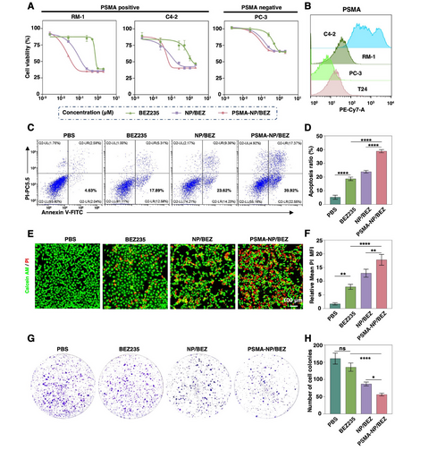 為評估 PSMA-NP/BEZ 的抗癌活性,研究人員通過MTT 法發現,在 RM-1、C4-2、PC-3 前列腺癌細胞系中,PSMA-NP/BEZ 的細胞毒性強于 BEZ235 和 NP/BEZ,對 PSMA 陽性的 RM-1 細胞 IC50 僅 40 nM,為后兩者的 1/150 和 1/117.5;流式細胞凋亡結果顯示,其誘導 C4-2 細胞凋亡率顯著高于另外兩組,死亡細胞比例也更高;克隆形成實驗表明,該組 C4-2 細胞克隆數遠少于另兩組。此外,WB結果顯示PSMA-NP/BEZ不會誘導腫瘤細胞發生免疫原性細胞死亡,與預期一致。