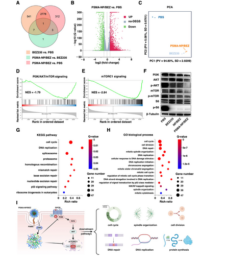 為了探究 PSMA-NP/BEZ 的作用機制,研究人員對經 PBS、BEZ235 和 PSMA-NP/BEZ 處理的 C4-2 細胞進行 RNA 測序和 WB 分析,結果顯示 PSMA-NP/BEZ 與 BEZ235 僅存在 12 個差異表達基因,PCA 分析也證實兩者作用機制高度相似,其中 MMP9 雖在兩組間有顯著差異表達且表達模式獨特,被推測可能是機制差異關鍵基因,但 WB未檢測到兩者 MMP9 蛋白水平的顯著差異;進一步通過富集分析與 WB實驗發現,PSMA-NP/BEZ 可顯著抑制 PAM 及 mTOC1 信號通路,降低 PAM 通路關鍵蛋白PI3K、p-AKT、p-mTOR及下游 p-S6 的表達,還能顯著下調細胞周期、DNA 復制修復、p53 信號通路等 PAM 下游通路相關基因,綜上可知 PSMA-NP/BEZ 與 BEZ235 作用機制相似,均通過抑制 PAM 通路、破壞細胞增殖等功能發揮抗癌作用。