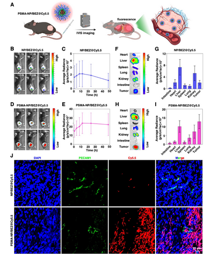 為提升納米顆粒腫瘤靶向性,研究人員在其表面修飾 PSMA 配體,在RM-1 前列腺癌皮下腫瘤模型中,通過注射熒光標記的 NP/BEZ@Cy5.5(未修飾 PSMA)與 PSMA-NP/BEZ@Cy5.5結果顯示,NP/BEZ@Cy5.5在腫瘤部位 12 小時達蓄積峰值后,48 小時仍維持高滯留,離體檢測發現其腫瘤熒光強度顯著高于肝腎,且免疫熒光顯示其能穿透血管、在腫瘤組織廣泛分布;PSMA-NP/BEZ@Cy5.5 8-12 小時達峰后下降,主要在肝腎富集。綜上,PSMA-NP/BEZ能通過血管有效滲透至腫瘤內部。