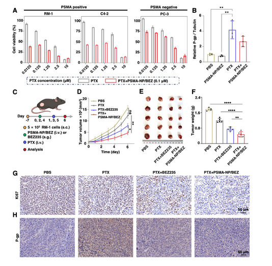 以 P-gp為代表的轉運蛋白會將藥物排出細胞導致耐藥,在zi杉醇(PTX)耐藥的前列腺癌細胞中 P-gp 過表達,而抑制 PI3K 通路可通過降低P-gp 逆轉耐藥,研究人員推測 PSMA-NP/BEZ 能增強 PTX 抗癌效果。研究人員發現,體外四種前列腺癌細胞系中,PTX+PSMA-NP/BEZ 聯用抗癌活性強于單獨用藥,PSMA 陽性細胞中更顯著,且聯用可降低 PTX 誘導升高的 P-gp 水平;體內 RM-1 荷瘤小鼠實驗中,PTX 單獨抑瘤弱,而聯用組腫瘤抑制率顯著高于 PTX和 PSMA-NP/BEZ組,平均腫瘤重量也更低,免疫組化結果顯示聯用組 Ki67和 P-gp 表達均降低。綜上,這些結果表明,PTX +PSMA-NP/BEZ 的聯合治療對前列腺癌具有優異的抗腫瘤功效,其作用機制通過下調 P-gp 的表達來降低 PTX 的耐藥性。
