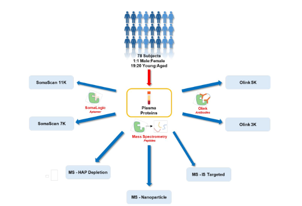 該實驗采用包含78例的志愿者的隊列,男女比例為1:1,其中包括40個老年人(55-65歲)和38個年輕人(18-22歲)。血漿樣品通過血漿置換法收集,并使用7個蛋白質組學平臺進行分析,如圖1所示。為了清楚起見,我們將把Olink Explore 3072和Olink Explore HT分別稱為Olink 3K和Olink 5K。同樣,MS-based工作流程將被指定為MS-Nanoparticle (Seer Proteograph™XT), MS-HAP Depletion (Biognosys TrueDiscovery™平臺使用高豐度蛋白質耗盡)和MS-IS Targeted (SureQuant™內部標準觸發-平行反應監測)。SomaLogic 11K包括11083項分析,其中10776項人類蛋白質分析針對9852種獨特蛋白質,對應9645種不同的UniProt id。SomaLogic 7K包括7,596項分析,其中7,288項人類蛋白質分析針對6,467種獨特蛋白質,對應6,401種不同的UniProt id。Olink 5K和3K檢測分別針對5,416和2,925種獨特的人類蛋白。