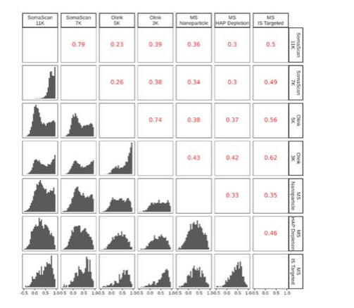 2. 數據重復性:SomaScan 11K ≈ SomaScan 7K > Olink 3K > MS-Nanoparticle ≈ Olink 5K ≈ Olink 3K